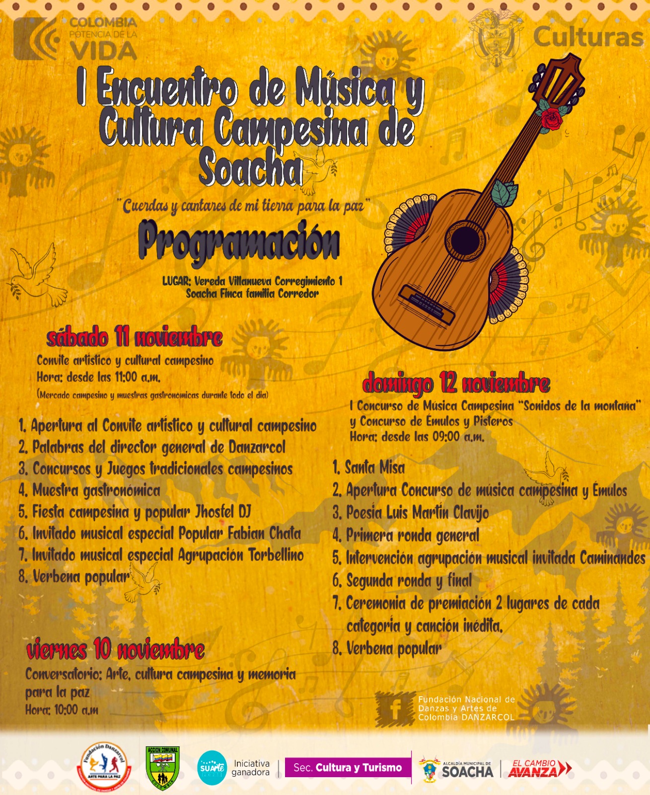 Este fin de semana se realizará con el apoyo del Ministerio de cultura y la Secretaría de Cultura y Turismo de Soacha, el 1er Encuentro Regional de música y cultura Campesina bajo el slogan ‘Cuerdas y cantares de mi tierra por la Paz’.