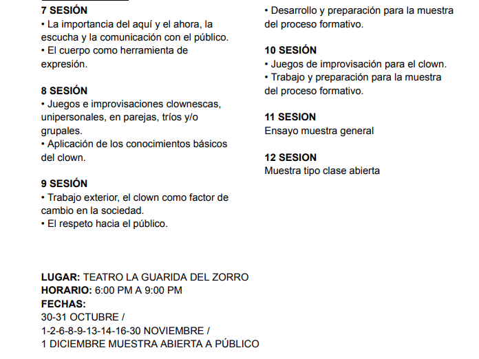 LABORATORIO DESCUBRAMOS NUESTRO CLOWN. “El clown es un personaje que el actor crea desde su propio interior con base a su ingenuidad, torpeza, desnudes, total fracaso, disponibilidad y capacidad de sorpresa de lo que lo rodea y hasta de sí mismo.” DUCLOWN TEATRO invita a participar del LABORATORIO DESPERTANDO NUESTRO CLOWN proyecto ganador de la convocatoria Suarte Concertación de la secretaría de Cultura y turismo de Soacha. Uno de los principales objetivos es darle continuidad a los diferentes procesos de formación que ha llevado el grupo en el territorio en los últimos 5 años: ACADEMIA DE PAYASOS (2019) – 1 SEMINARIO NACIONAL E INTERNACIONAL PAYAXOS POR SUACHA (2021) – CHAPOTEANDO LA ESCENA (2022) LABORATORIO DESPERTANDO NUESTRO CLOWN se compone de 12 sesiones cada una con una intensidad de 3 horas cada una, para un total de 36 horas de aprendizaje y mucha diversión certificadas. El laboratorio se desarrollará entre el 31 de octubre y el 1 de diciembre en las instalaciones del Teatro La Guarida del Zorro ubicada en el barrio la despensa.