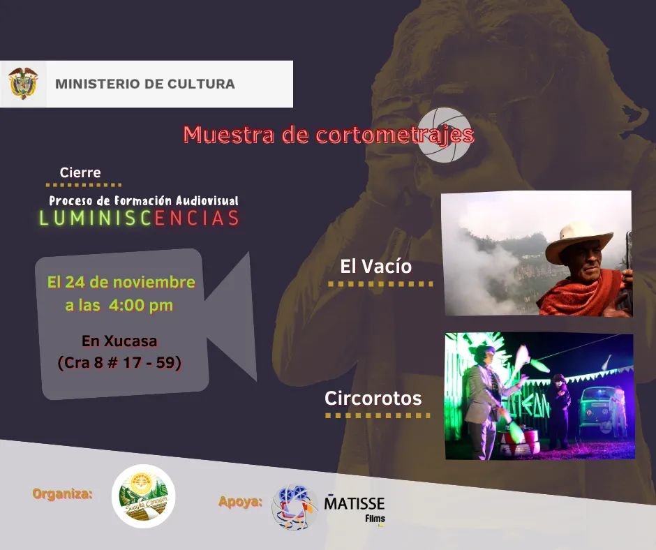 Con un conversatorio y proyecciones de 2 cortometrajes, en el Centro Cultural Xucasa en la comuna 2, se presentó la culminación del proyecto audiovisual Luminiscencias, ganador del programa nacional de estímulos 2022 del Ministerio de Cultura por parte del colectivo Suacha Conexión Y Matisse Films.